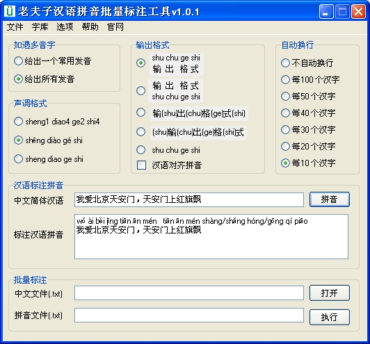 1,将需要标注拼音的中文拷贝到文本文件(.txt),作为源文件; 2,选择拼音格式,然后执行;