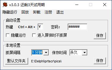 自动截屏(不是录像,不占内存,不影响电脑运行) 可设置每隔5秒~60分钟截屏一次 开机自启动(如不能自启动,请调节UAC设置) 支持隐藏运行(删掉桌面快捷方式,不留痕迹) Ctrl+Alt+Y调出软件界面,详细教程 记录查询:软件菜单-记录-打开记录文件夹查看